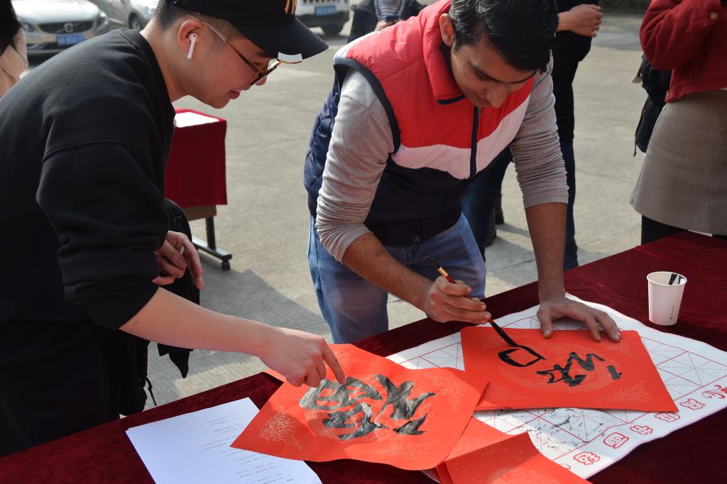 现场有同学说“往年都是去外面买,春联内容大同小异,没啥新意,今年就不一样啦,我可以把自己想写的写出来!在今天的活动中,廉明和传统文化得到了有机结合,我们学到了很多!”还有一位印度留学生,拿起毛笔不知如何下手,在现场同学的耐心讲解和指导下,写出了“福”字,同学们纷纷为他点赞鼓励。