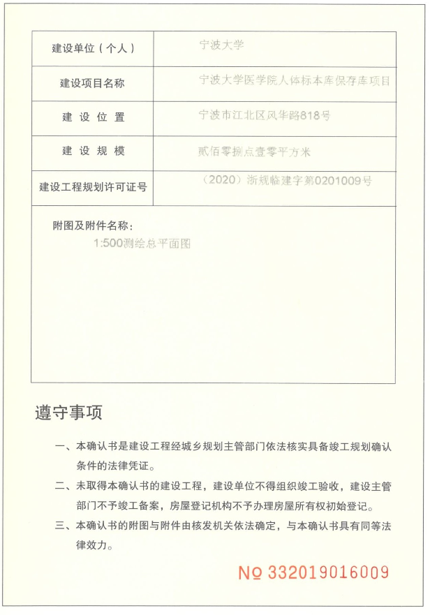 近日,医国产av自拍人体标本保存库项目通过规划验收,取得《浙江省建设工程规划核实确认书》。该项目于去年底竣工,该工程由宁波卓艺建筑装饰工程有限公司负责施工,宁波宁大建筑设计院有限公司设计,宁波宁大建设监理有限公司监理。