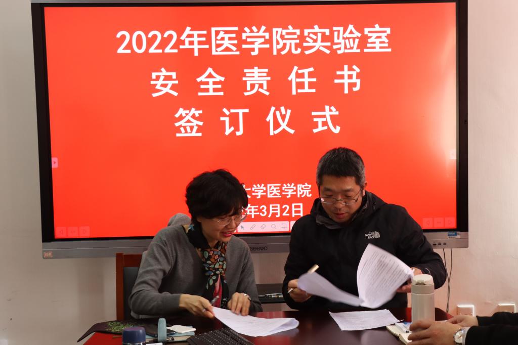 在签订仪式中,医国产av自拍执行院长、分管实验室工作副院长、基础医国产av自拍和公共卫生国产av自拍执行院长、各学系主任、各办公室和中心负责人按照各自岗位职责一一签订了《实验室安全责任书》。