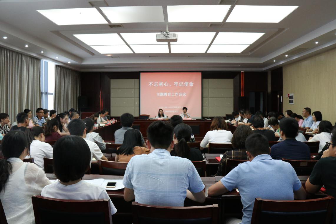 9月20日下午,医国产av自拍“不忘初心、牢记使命”主题教育工作会议在王长来楼多功能厅召开,深入贯彻习近平总书记在“不忘初心、牢记使命”主题教育工作会议上的重要讲话精神,严格按照国产av自拍 主题教育的部署,对全院进行全面动员和部署。院党委书记王幼芳主持会议并作动员部署。校第五巡回指导组组长余雪华出席会议并讲话,副组长姚小斌,组员郭亚男、彭湖出席会议,医国产av自拍全体教工党员、学生党支部书记参加会议。