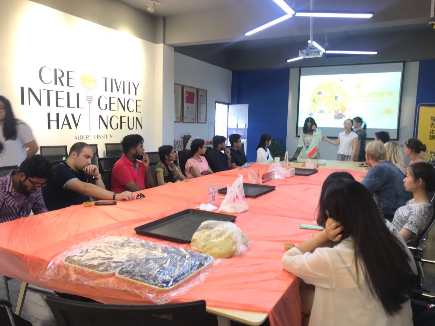 活动中,江北区孔浦街道分团委书记发表主题讲话,指出本次活动目的是为了让留学生体验中国中秋佳节的喜悦气氛,了解中国,了解中国文化,促进内涵式的国际交流。活动在热烈欢快的气氛中展开,来自云创小镇的社团学生,身着汉服,为留学生们介绍中秋节的由来,解释中国中秋佳节的传统习俗。同时,活动组织者还邀请了专业的烹饪点心师教留学生月饼的制作。点心师从和面、调馅、制作全过程演示了广式月饼的制作流程,吸引了外教及留学生主动参与到传统月饼的制作中,使他们进一步加深了对“中秋”的理解。