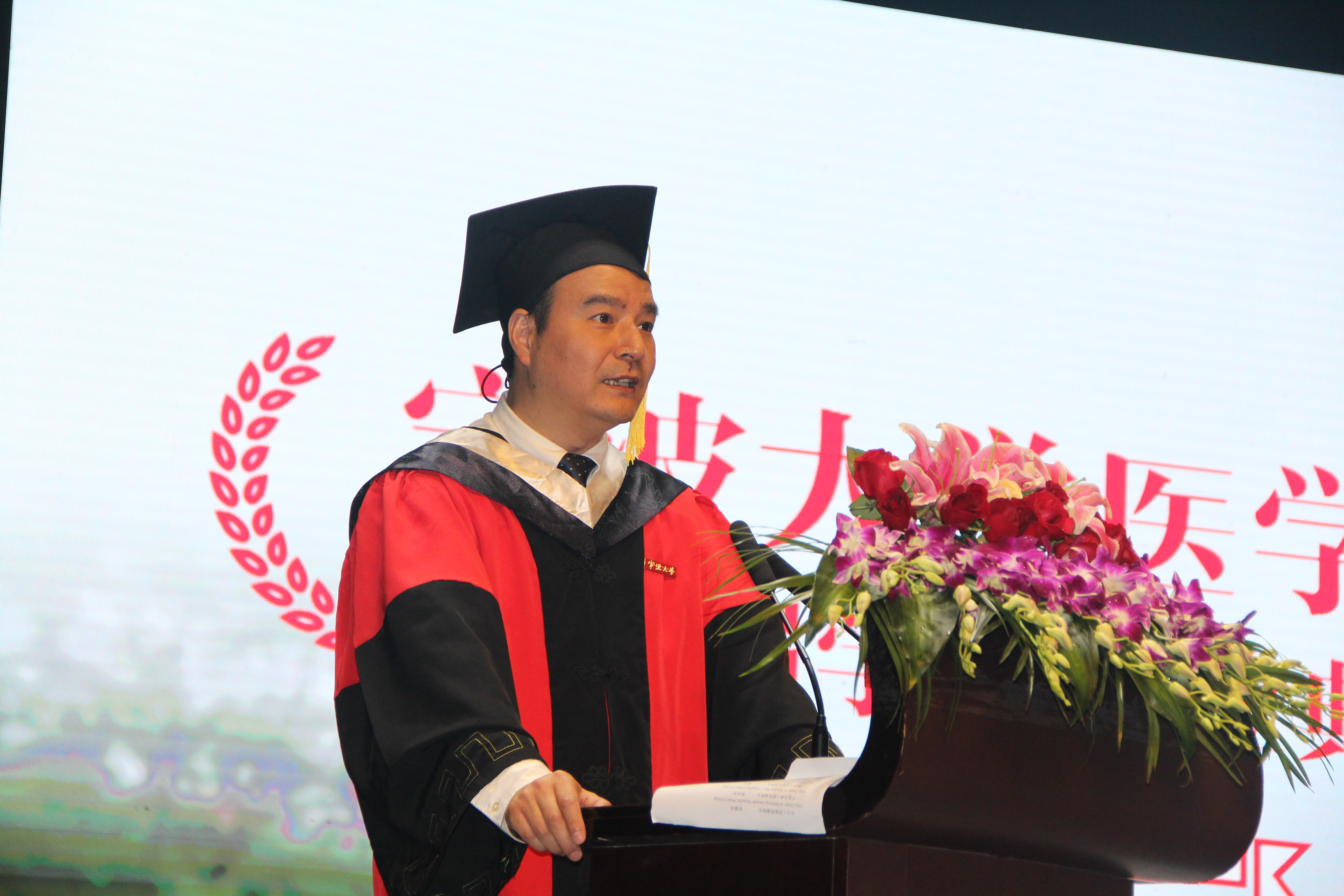 教师代表郭俊明结合自身求学历程,期望毕业生们怀仁心仁德,树立目标,并举了自己大学校友的成功案例,以此激励全体毕业生,不断修炼,不断超越自己,励志成为一名受人尊敬的仁医名医。