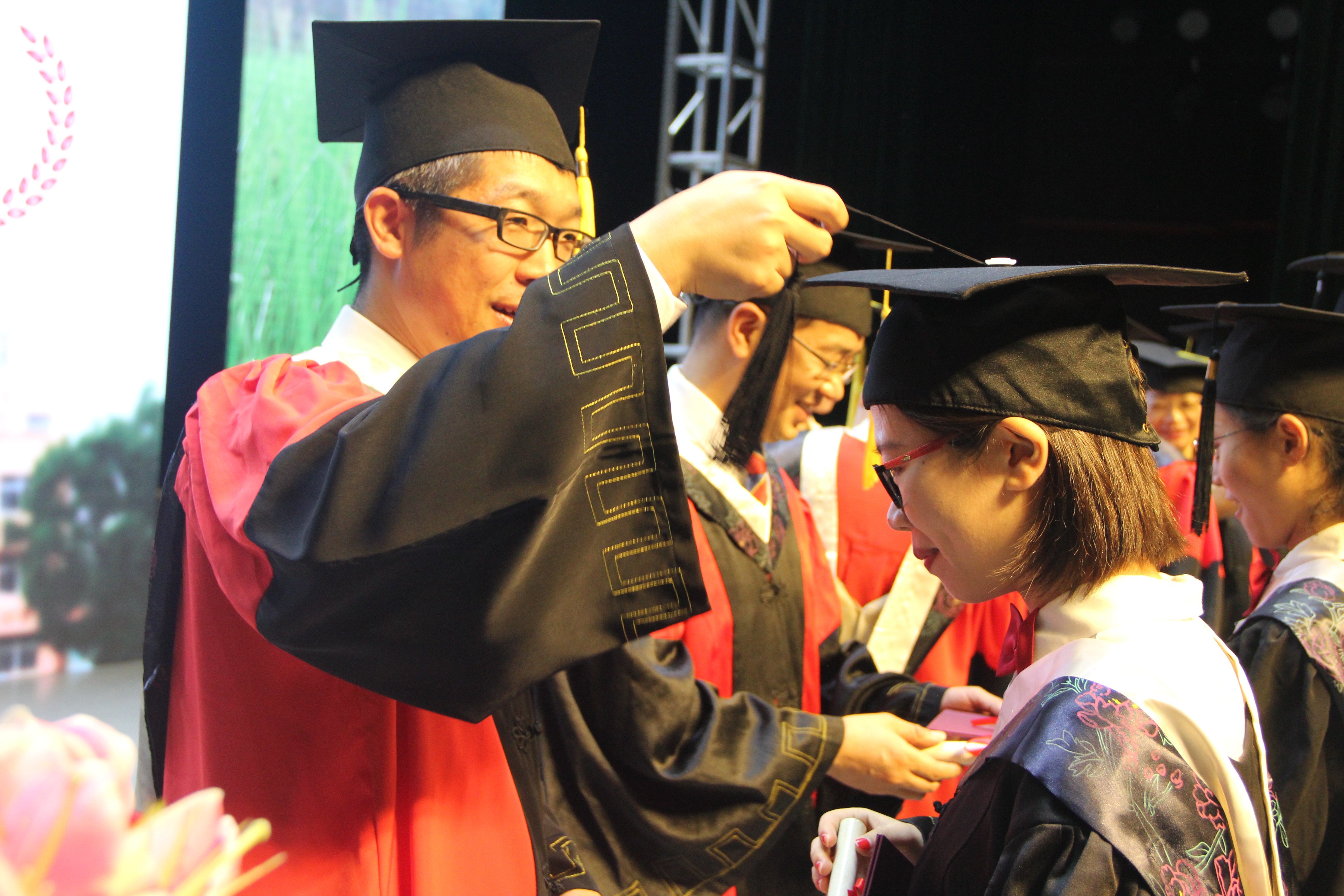 院领导为班级校友联络员聘书后,毕业生代表在导师们的引领下,伴随着厚重隽永的音乐,昂首走出至真之门,迈向美好未来。导师将毕业生的手交到医院老师和家长代表的手中,象征着医学生学成毕业、走向社会的交接和传承,也预示着毕业生将勇敢承担起家庭、事业和社会的责任,学以致用,感恩父母,回馈社会。在庄重、感人的氛围中,毕业生们向医院老师和家长代表献上鲜花。整个环节令全体师生油然而生神圣感、自豪感,也使不少学生和家长感动得数度落泪。