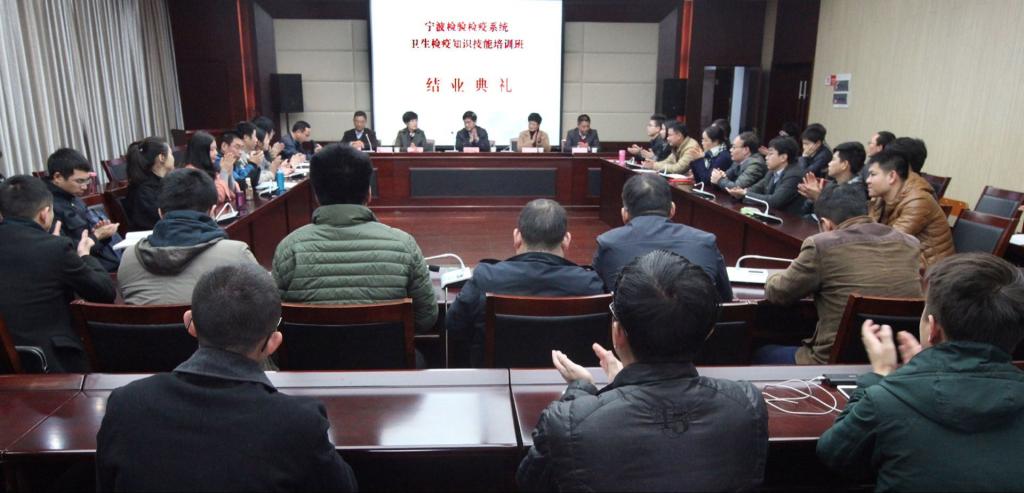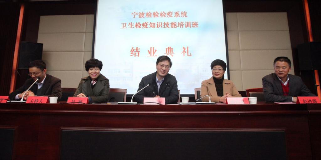 12月10日下午,“宁波检验检疫系统卫生检疫知识技能培训班”结业仪式在医国产av自拍王长来楼二楼多功能厅举行, 全班53名学员参加了仪式。仪式由宁波检验检疫局卫检处处长施惠祥主持,检验检疫局副局长周力沛、医国产av自拍党委书记骆巧凤出席并作了重要讲话,检验检疫局人事处副处长吴颖、医国产av自拍预防医学学科系主任赵进顺、学科系副主任张莉娜等出席仪式。