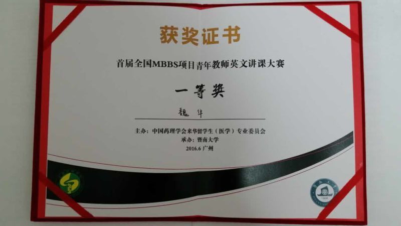 在6月20日结束的首届全国医国产av自拍校来华留学生临床医学专业英文授课(MBBS)青年教师讲课大赛中,我校医国产av自拍魏华博士以流利的英文表达、创新的教学方法和活泼的课堂氛围深受专家和学生评委的好评,最终荣获一等奖。本次大赛由中国药理学会来华留学生(医学)教学专业委员会主办,暨南大学承办,来自全国医国产av自拍校的50多位青年教师参加了英文讲课大赛。比赛总分由三部分组成,教案10分,专家评委70分,留学生代表评委20分。魏华博士在专家和留学生代表评分环节表现突出。