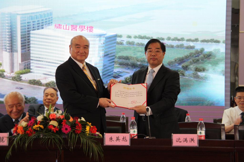 仪式上,朱英彪先生向国产av自拍 捐赠绣山医学楼助建款,沈满洪校长向朱英彪先生颁发捐赠证书,市台办施金国主任向朱英彪先生赠送了纪念礼品。之前,朱英龙、朱英彪先生等嘉宾与领导还座谈商讨了绣山医学楼建设情况和医院未来发展规划,并参观了医院有关场所,前往朱绣山先生铜像前瞻仰纪念。